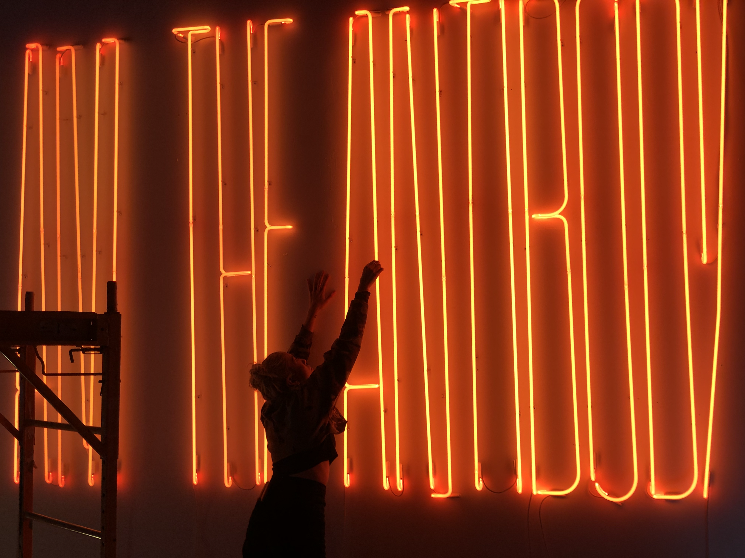 Standing seven feet tall, the phrase “I AM THE ANTIBODY” pulses in bold orange neon, flooding the space with a protective glow. The piece serves as both declaration and defense.