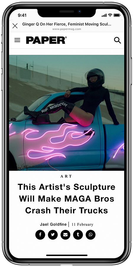 Rooted in Los Angeles signage culture and influenced by the aesthetics of drag racing, Cabroncita places womxn, armed, styled, and unapologetic, behind the wheel. Neon flames, custom decals, and dominatrix boots stamped with “RIP MISOGYNY” convert the truck into both sculpture and site of resistance. Drawing from a range of seductive visual codes, the work dismantles misogyny by reclaiming control over movement, space, and narrative.